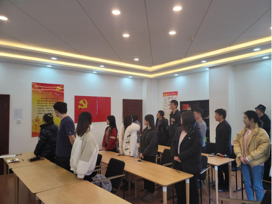 会议伊始,本次被组织吸收为预备党员的陈迈同志面向党旗进行了入党宣誓仪式。在组织委员李昂同志的领誓下,陈迈同志面向党旗,举起右手,伴随着庄严的国歌,进行了入党宣誓。