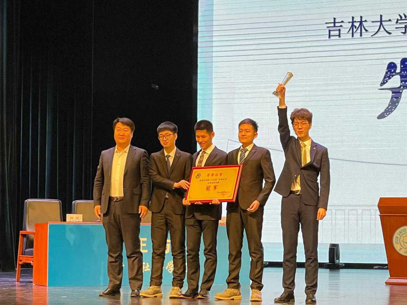 辩论队成功获得本次大赛的冠军奖牌,同时,张座明同学也获得了“最佳辩手”的奖杯。颁奖仪式结束后,辩论队的其他同学纷纷上台拥抱四位主辩手,大家在舞台上合影留念,体现了队员们的团结与友谊。