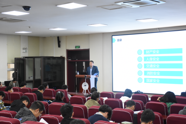 在计算机楼B108室举行了2021级新生校园安全教育专题讲座,全体新生同学参加了此次讲座。讲座由具有丰富工作经验的保卫处左学成老师主讲,内容主要围绕财产安全、人身安全、交通安全、消防安全、国家安全五大主题。