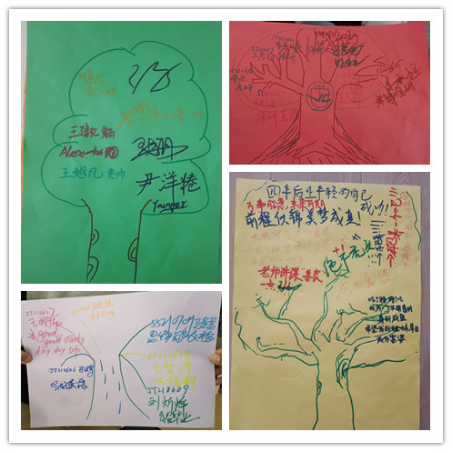热身游戏后,同学们随机分组,在依次进行简短的自我介绍后,开展“快乐传递”、“信心启迪”、“信任之旅”等小游戏。“快乐传递”活动让同学们将自己的想法和祝愿写在卡片上,鼓励同学们主动交际,不惧未来;“信心启迪”活动让同学们写下自己的三个小目标,为今后的大学生活明确前进方向;“信任之旅”活动,所有同学分批次体验“盲人”感觉,在没有语言沟通的情况下由“引路人”带领到达终点,增强同学间相互信任。以上活动使同学们收获了同学情谊,增强了集体意识,挖掘了自身潜能,调整了自己心态,明晰了努力方向,增进了彼此友谊。随着活动接近尾声,在《相亲相爱的一家人》的背景音乐声中,同学们拿起手中的画笔,共同绘制了一幅《团体树》,写下新学期的美好祝愿。至此,肉漫屋