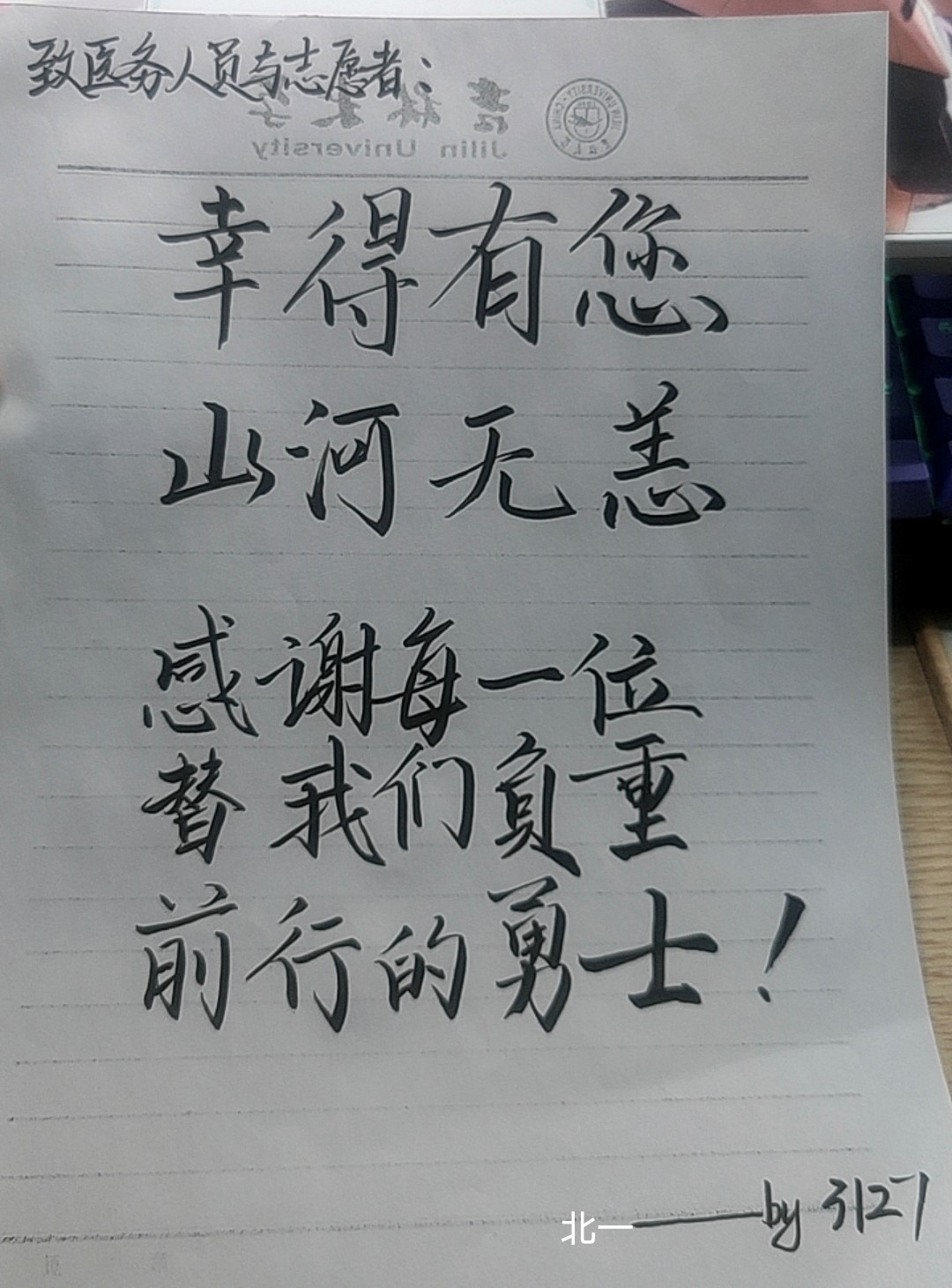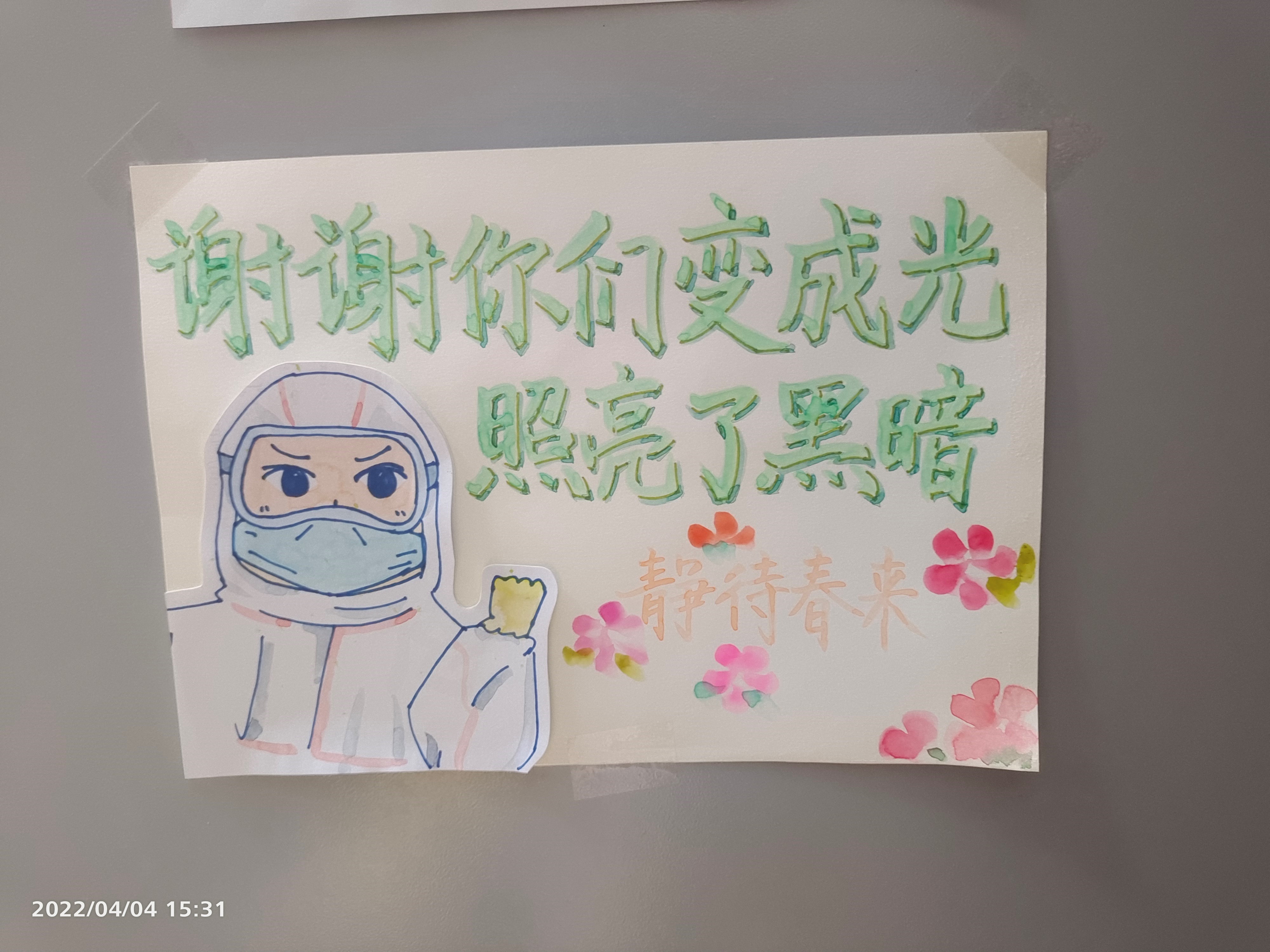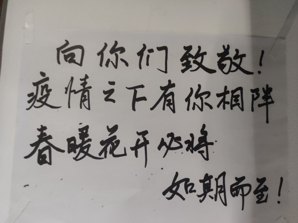 活动期间,同学们表现出了极大的参与热情,纷纷以寝室为单位,通过手写卡片并张贴的方式,将爱注于笔端。一条条诗文或寄语,表达了对奋战在疫情防控工作一线的志愿者最真诚的感激和祝福,蕴含了对美好未来的憧憬和祈盼,也赋予了志愿者强大的精神力量。