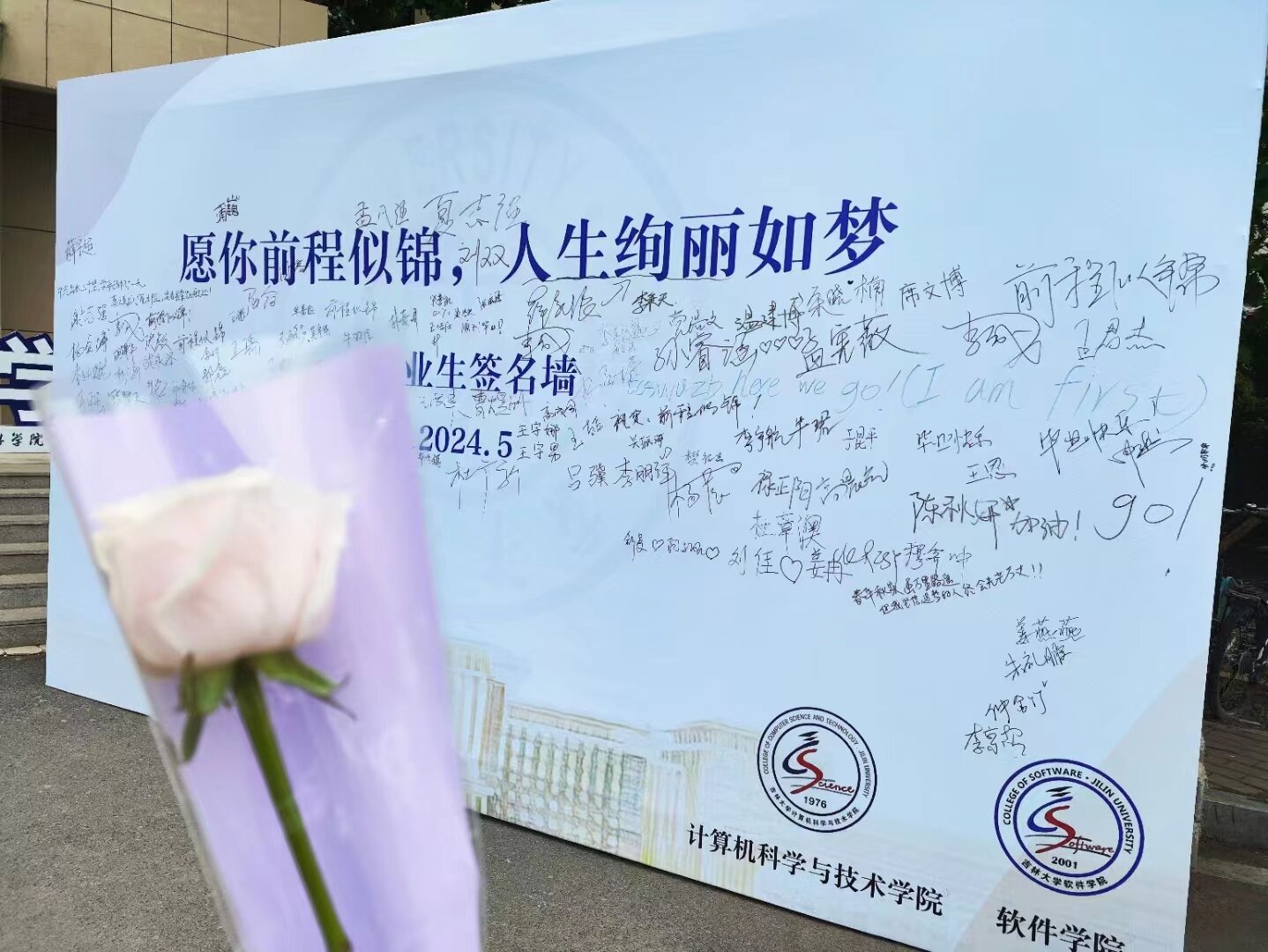 此次毕业季活动分为签名墙合影、人生新航程、送你一朵小红花三个活动。活动伊始,学院领导在签名墙前进行签名留念,代表全体学院老师导师表达对毕业生的谆谆教诲和亲切关心。随后,毕业生也纷纷来到签名墙前,或签下姓名表达对母校的不舍与感恩,或留下美好祝福祝愿母校蒸蒸日上,并在签名墙前合影留念,记录下灿烂的毕业时光。