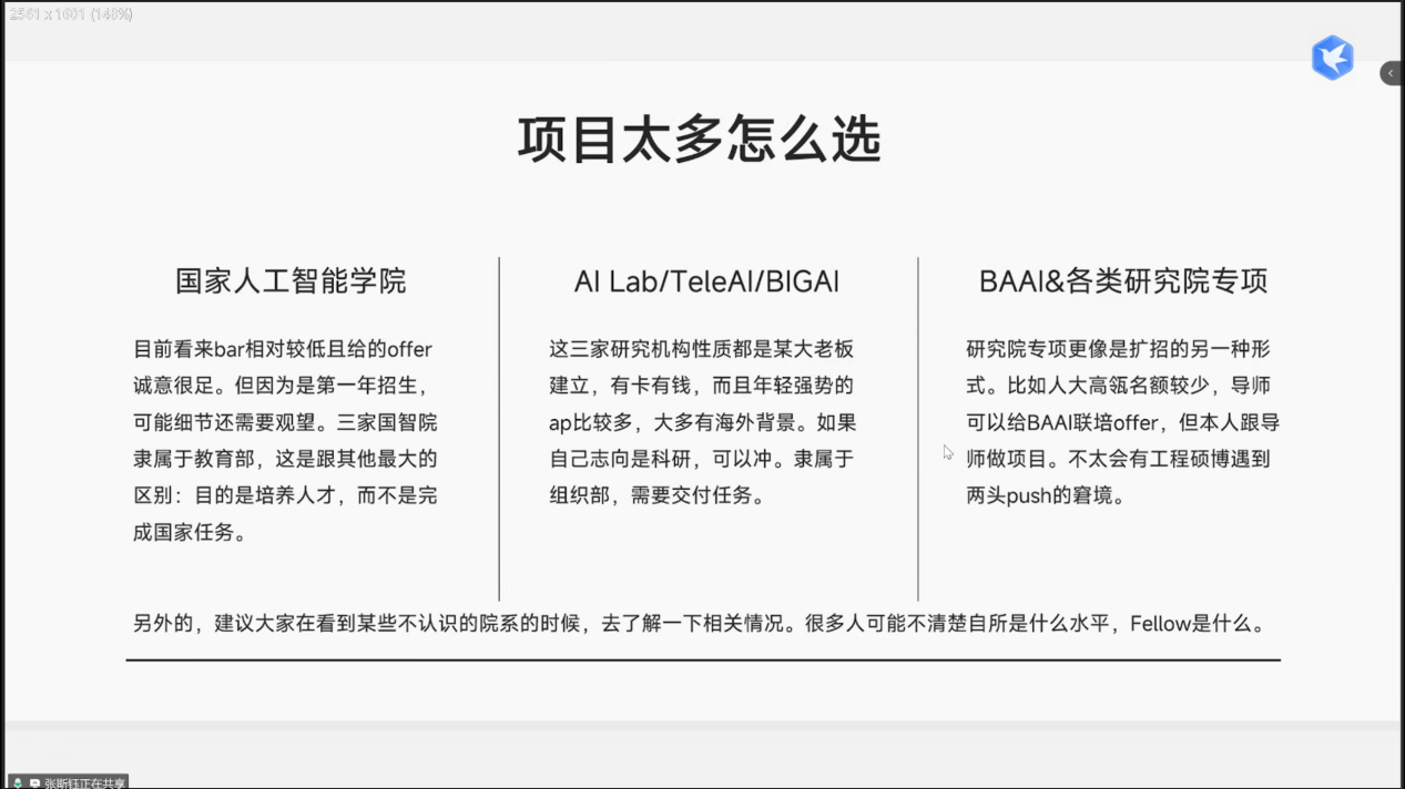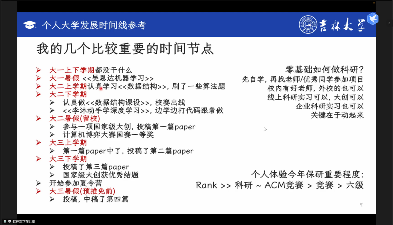 会上,陈庆喜解读研招网政策,明确绩点定保研初试、目标校考核定复试的核心逻辑,她建议同学们从本科课设切入科研,通过阅读CCF A类论文、参与科研项目积累学术素养;鲍俊则拆解保研全周期,6-8月夏令营竞争最激烈,8-9月预推免是上岸关键期,9-10月9推/10推风险高,同时针对“rk(专业排名)”、“套磁”等保研常用术语进行科普;陈驰水结合自身经历,提出科研准备需结合职业规划,提醒大家减少“经验帖焦虑”,避免沉迷各类分享内容,应将重点放在入营后考核经验总结与自身能力提升上;关玉卓分享信息收集方法,推荐用表格对比院校情况实现精准选校,考核准备方面,她建议笔试针对性背目标校题库,机试每日刷5-6道LeetCode Hot100题,针对边缘同学,她建议采取“海投套磁”策略,梳理提炼自身参与的各类竞赛与课设经历,提升竞争力;赵梓霖强调选导师时应优先考虑科研方向匹配度,在套磁前应研读导师发表的论文,备考上,他推荐每日兼顾2小时算法训练与3小时项目推进,保持高效状态;平景龙提供多元化的保研路径参考,他推荐通过院校官网、ResearchGate等平台搜集导师信息,为排名不占优同学介绍工程硕博、国优计划等小众路径,提醒大家在面试时突出个人核心优势;张斯钰建议同学们按规划理性选校,若大家以就业为目标,应侧重“学校title+实习资源”,若计划走科研道路,则需优先考虑“导师水平+课题组实力”。