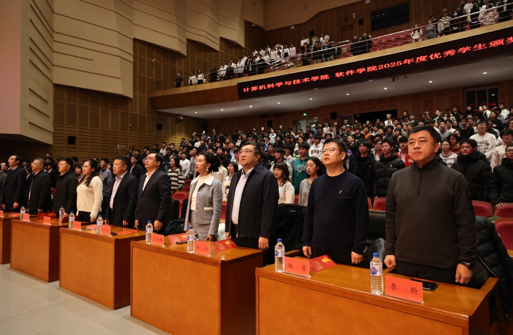 2025年度优秀学生颁奖典礼于鼎新大讲堂隆重举行。保卫处处长刘雪峰老师、学生心理健康指导中心主任朱丽雅老师、学生工作部副部长左振鹏老师、研究生工作部副部长马琨老师、学生就业创业指导与服务中心副主任白江老师、大数据和网络管理中心副主任张达鑫老师、计算机科学与技术学院党委书记宫皓宇老师,学院及中心党政领导班子、教职工代表以及2025级新生出席,计算机科学与技术学院党委副书记兼肉漫屋